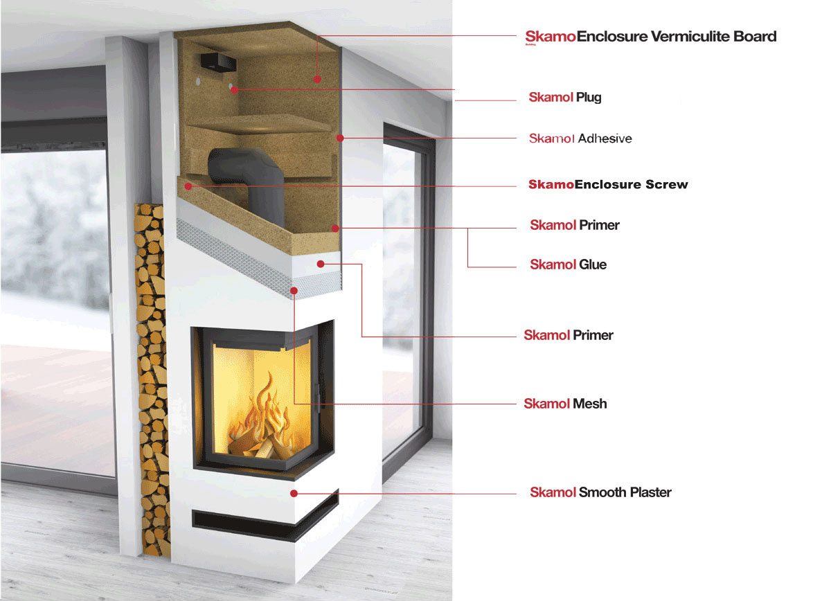Darüber hinaus erhöht Vermiculit die Verbrennungstemperatur. Es eignet sich hervorragend für alle Arten von Feuerstellen – sowohl für offene Kamine als auch für Einsätze und Heizkassetten. Vermiculit ist vielfach leichter als Schamotte. Die SkamoEnclosure Vermiculite Board-Platten bestehen aus Vermiculit, einem sehr guten Isolator. Sie reduzieren erheblich die Erwärmung des Metallgehäuses, indem sie die während der Verbrennung entstehende Wärme im Feuerraum halten. Die Platten speichern nur wenig Wärme, wodurch sich der Kamin wesentlich schneller aufheizt.